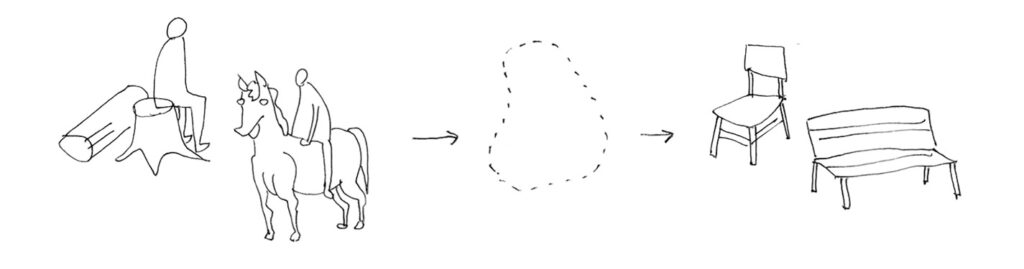 切り株や岩、動物の背中など、人は自然の中に腰掛けたり身を委ねたりする場所を見つけてきた。一方で人は「座る」という目的に最適な形を求め、椅子という家具を洗練させてきた。ある物体が椅子として洗練される前の状態、決まった座り方があるわけではないもの。各々の人が好きなように座り方や身の委ね方を見つけ、コミュニケーションツールにもなるような家具の提案。