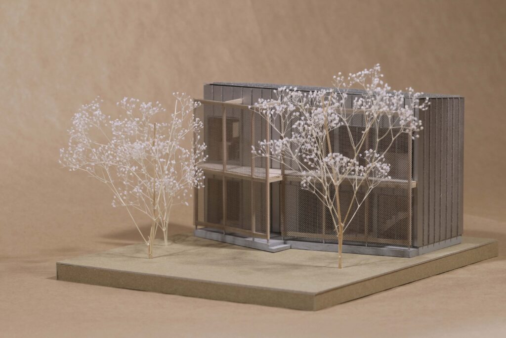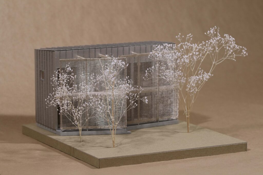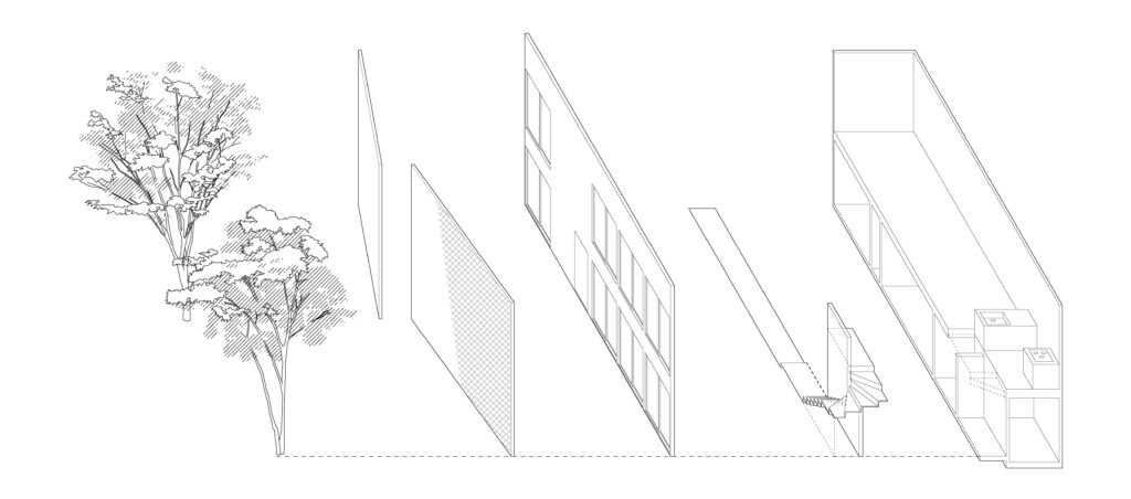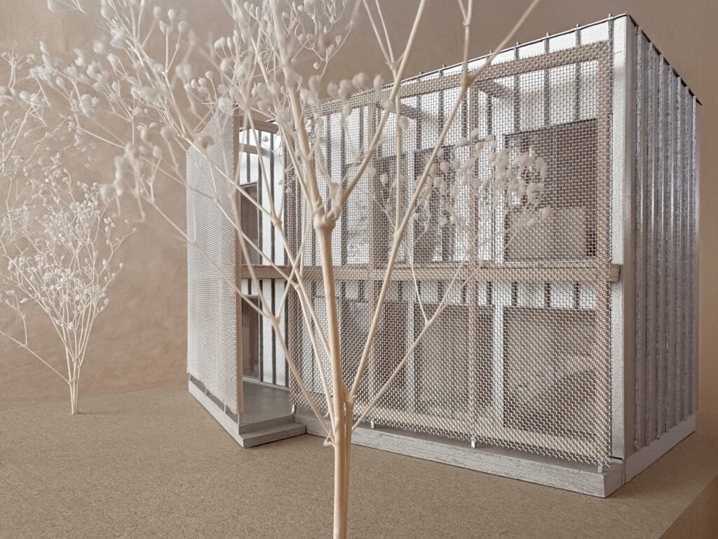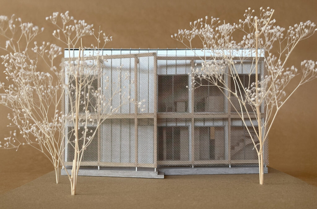 生活空間と敷地周囲との間を1枚の壁のみで隔てるのではなく、半透明な層がいくつも重なることでだんだんと両者の間が不透明になっていくような境界とする提案。